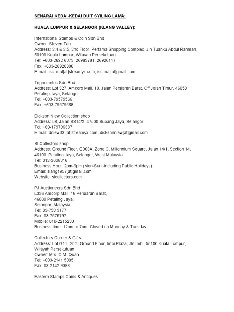 Senarai Kedai Kedai Duit Syiling Lama Pdf Strait Of Malacca Malaysia